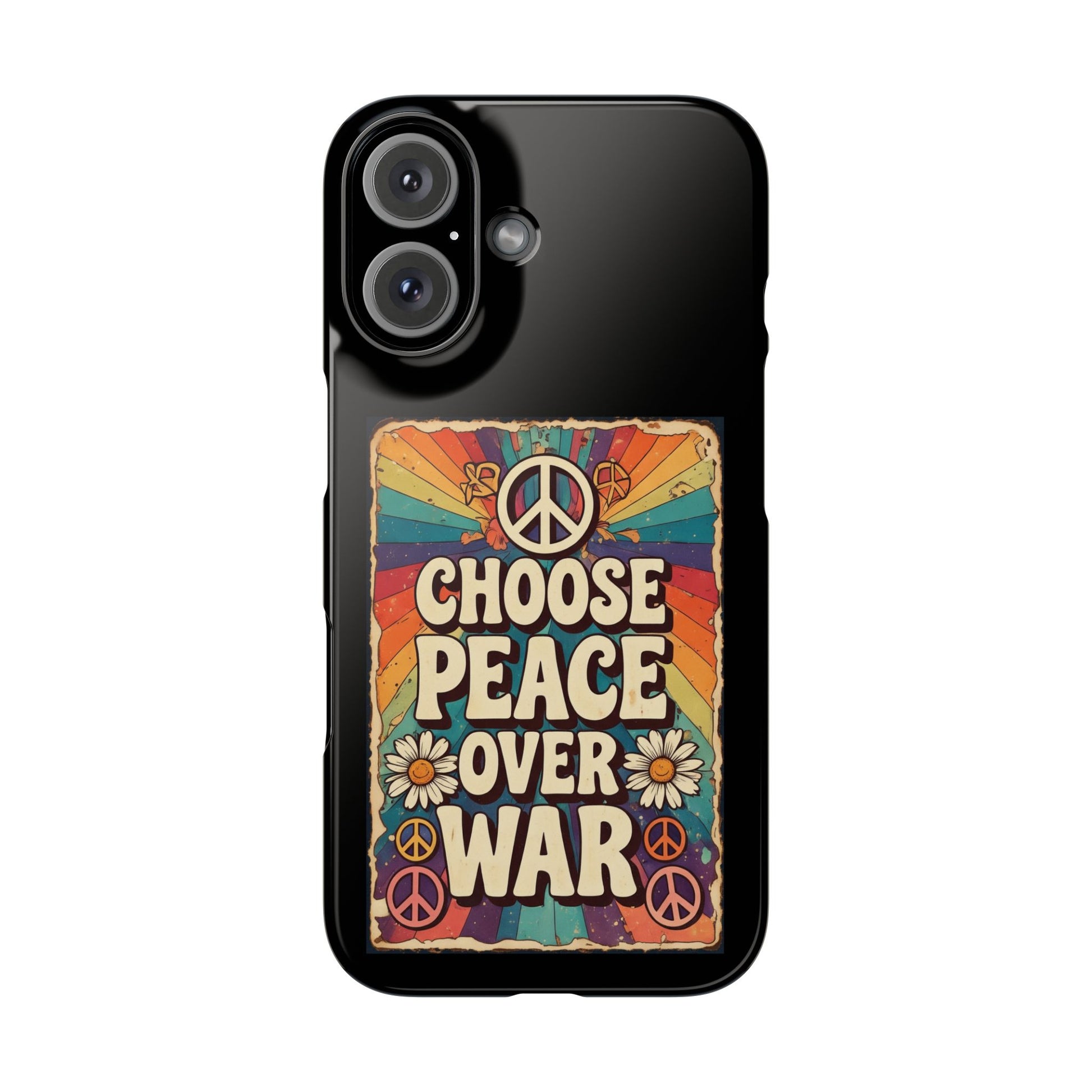 This slim phone case carries vintage peace-vibe artwork—rainbow rays, daisies, and a retro peace sign—so your phone feels like a small, wearable manifesto. The glossy finish keeps colors bright and the lay-flat bezel guards the screen from light scratches without adding bulk. It slips into pockets easily and still lets wireless charging work as you go about your day, whether you’re commuting, at a rally, or meeting friends at a cafe. The message reads loud and clear: choose calm, choose connection, choose compassion. It complements relaxed, expressive wardrobes and pairs naturally with tote bags, denim jackets, and vinyl stickers on your water bottle.